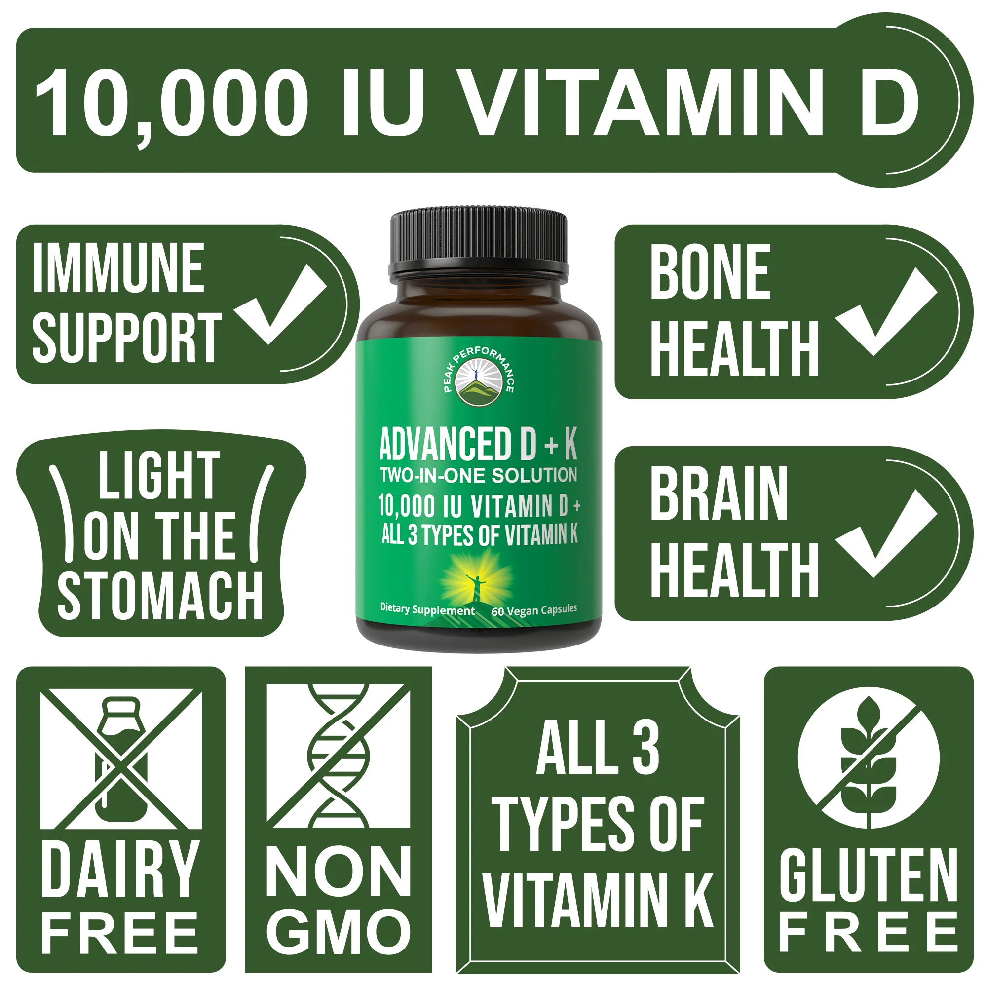- Most brands only give Vitamin D and miss out on it's important combination with Vitamin K. Peak Performance Vitamin D with All 3 Types Of Vitamin K for Strong Bones!*