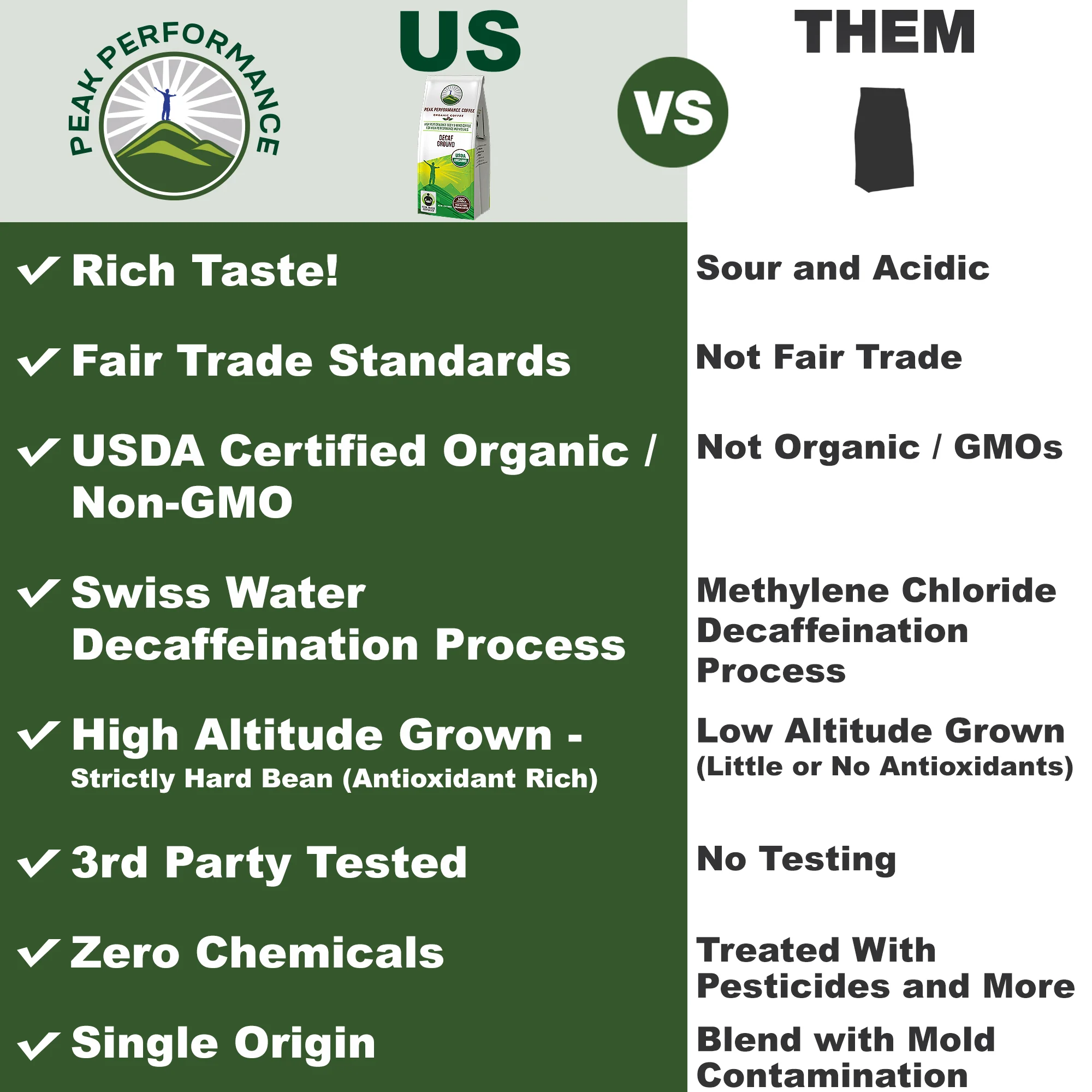 - Unlike many decaf coffees that use methylene chloride in their decaffeination process, Peak Performance decaf coffee is decaffeinated by Swiss Water Process Decaffeinated Coffee, Inc. using a water-only process. Our Coffee is Fair Trade, Low Acid, USDA Certified Organic, Single Origin, and grown at High Altitude. If We Could Make This Coffee Any Healthier We Would! Also Comes With Free Special Report Called "How To Make The Healthiest Cup Of Coffee"