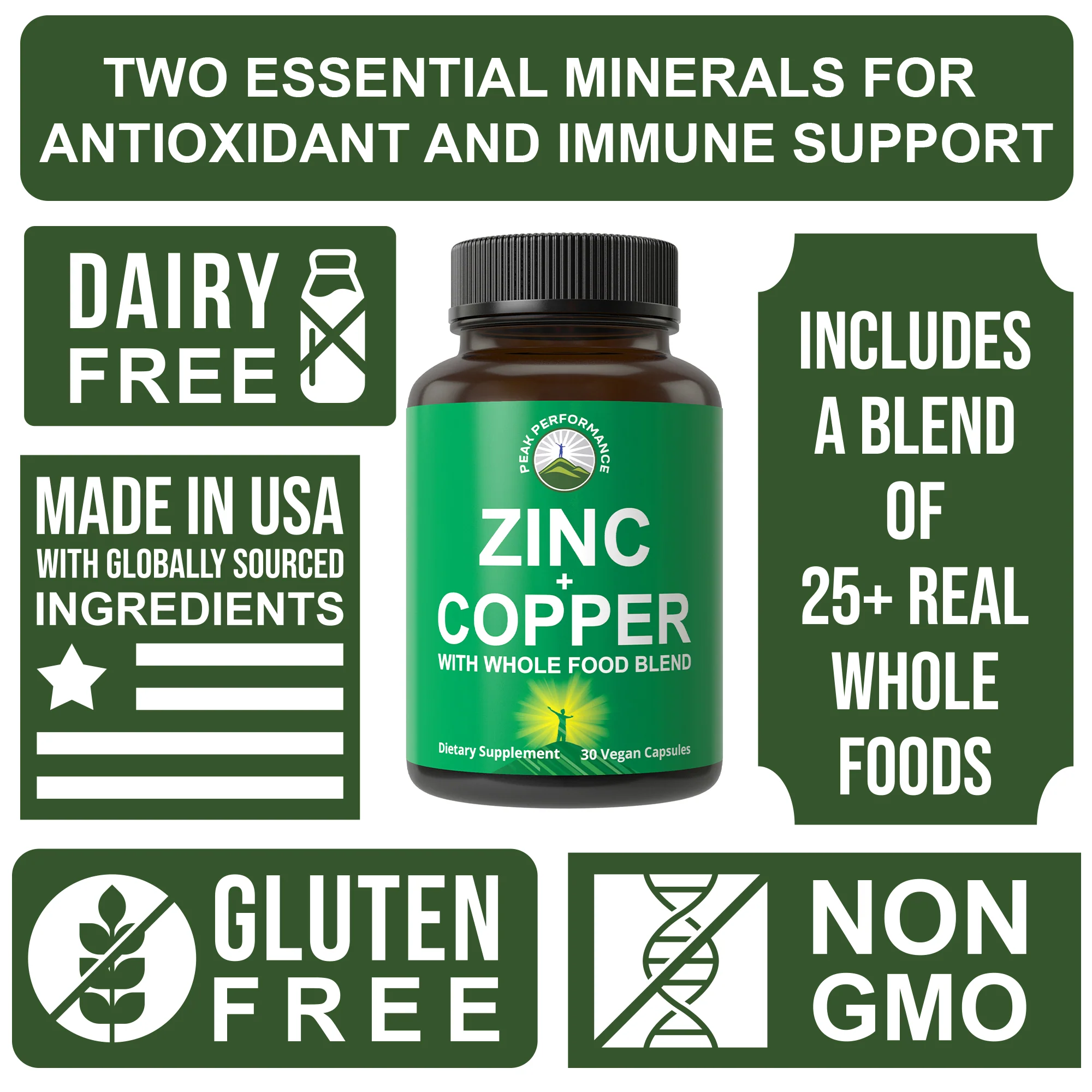 Peak Performance Zinc with Copper + Whole Food Blend of 25 Vegetables and Fruits for Max Absorption - Immune Support Supplement Capsules - Two Essential Minerals for Immunity - Pills for Men & Women